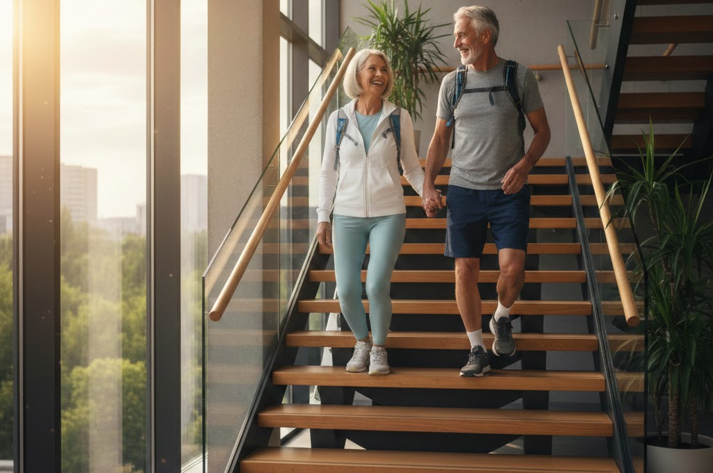 Daily movement habit of active seniors taking the stairs to stay fit after 60