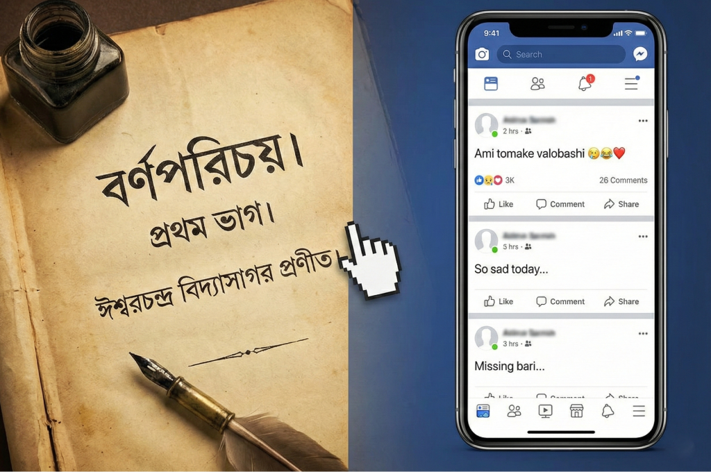 Digital Impact on Bengali Language showing a classic Bengali book on one side and a modern social media feed on a smartphone on the other