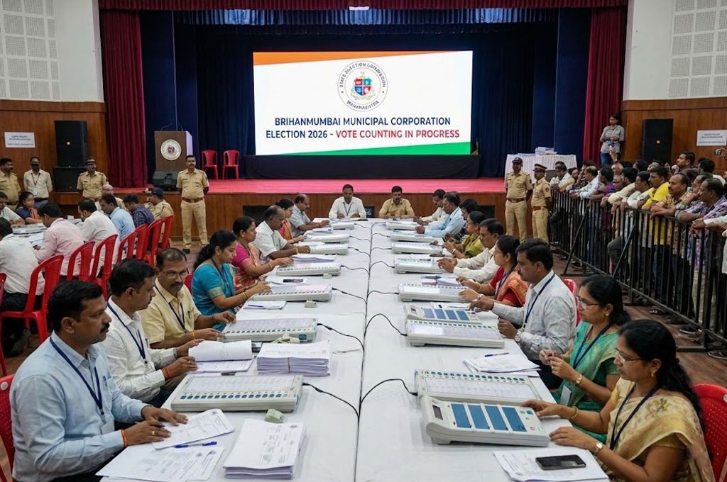 Election results Mumbai showing BMC election counting center and officials with EVM machines in Maharashtra 2026.