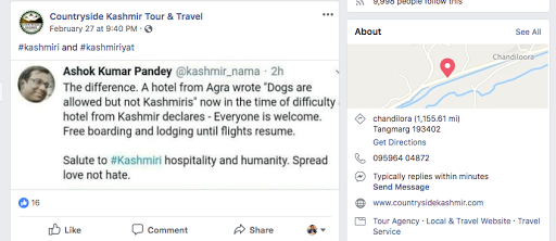 এক সর্বভারতীয় সংবাদমাধ্যমে প্রকাশ, সমস্যার সুরাহার ফেসবুক পোস্টের মাধ্যমে কাইজার নামে একটি হোটেল কর্তৃপক্ষ, প্রত্যেককে ফ্রিতে কাশ্মীরে ঘোরার জন্য আবেদন জানিয়েছে। সম্প্রতি  ‘কান্ট্রিসাইড কাশ্মীর ট্যুর এন্ড ট্রাভেলস’ নামে একটি ফেসবুক পেজে এই পোস্ট করা হয়েছে। পোস্টের  বার্তা, যতদিন না পর্যন্ত উপত্যকার পরিস্থিতি স্বাভাবিক হচ্ছে, ততদিন কাইজার হোটেল কর্তৃপক্ষ পর্যটকদের বিনামূল্যে হোটেলের ঘর দেবে। সেই ফ্রিতে খাবারও মিলবে। এই পেজে আরও পোস্টের মাধ্যমে বলা হয়েছে, কাশ্মীরে পর্যটকরা সম্পূর্ণ বিপদমুক্ত। তাহলে আর দেরি কেন? অ্যাডভেঞ্চার প্রিয় হলে বেরিয়ে পড়ুন।