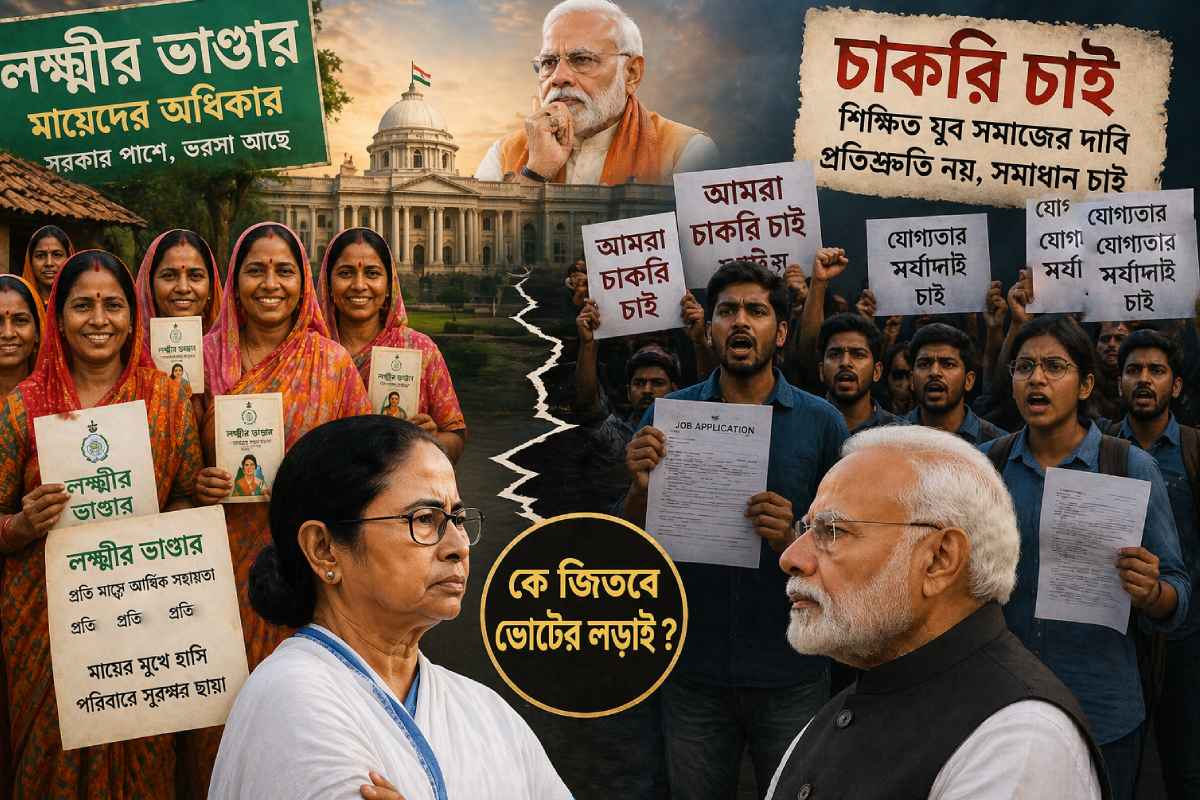 Lakshmir Bhandar vs Jobs Issue Bengal 2026 showing women beneficiaries and unemployed youth in political contrast