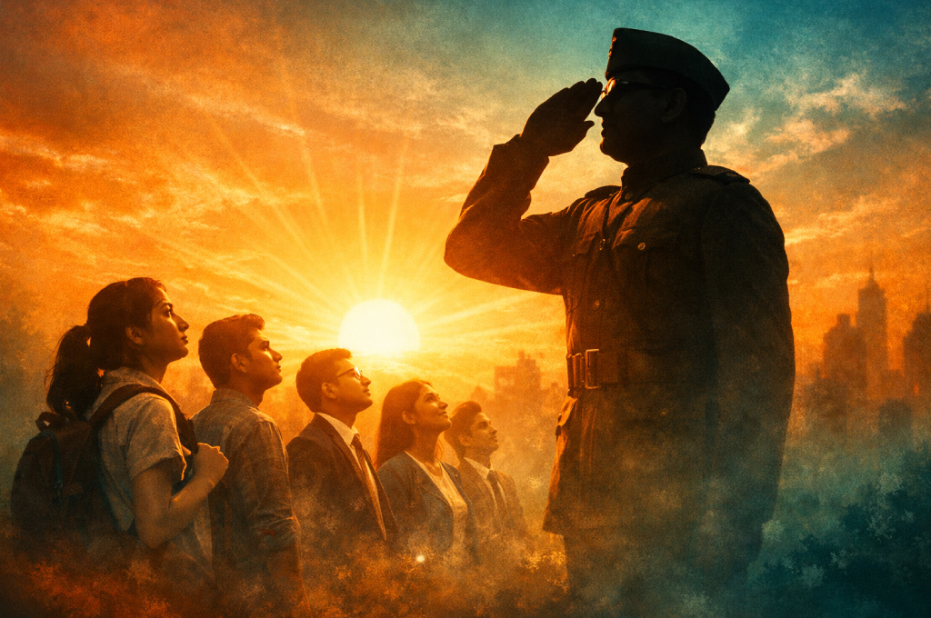 Conceptual art of Netaji Subhas Chandra Bose guiding the youth, representing Netaji Leadership qualities.