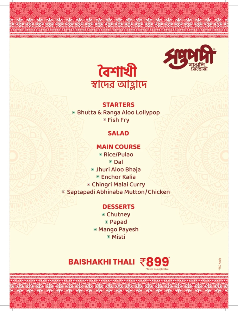 পয়লা বৈশাখ উপলক্ষে সপ্তপদীতে থাকছে বিশেষ বুফে আয়োজন, যেখানে মিলবে বাঙালির পছন্দের নানা পদ—ভাত, লুচি এবং শুক্তোর মতো ঐতিহ্যবাহী খাবার। পাশাপাশি থাকছে চিংড়ি মাছের মালাইকারি, নারকেল দিয়ে পাবদা মাছ এবং তাদের বিশেষ স্বাদের খাসির মাংস, যা এই দিনের অন্যতম আকর্ষণ।