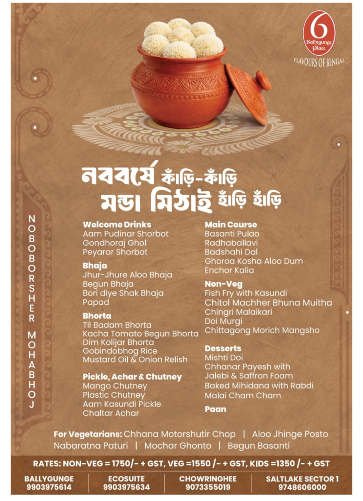 আজকের প্রতিবেদনে প্রথম যে রেস্তোরাঁর কথা থাকছে, সেটা হল ছয়, বালিগঞ্জ প্লেস। দক্ষিণ কলকাতার জনপ্রিয় এই রেস্তোরাঁয় মিলবে খাঁটি বাঙালি রান্নার অসাধারণ সম্ভার। পয়লা বৈশাখে বিশেষ থালি বা বুফে মেনু থাকে, যেখানে থাকছে লুচি, চিংড়ি মালাইকারি, কষা মাংস, মিষ্টি দই—সবই মধ্যবিত্তের নাগালের মধ্যে।