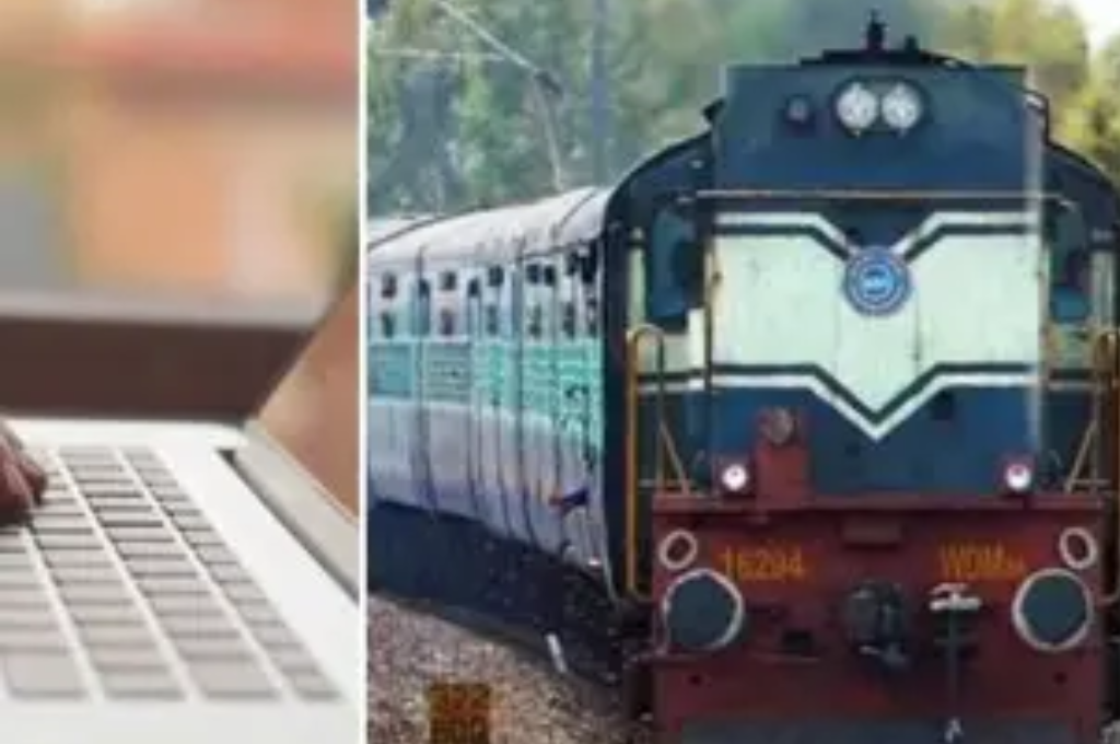 Person booking a train ticket online beside an image of an Indian Railways train — illustrating the UTS App shutdown and the shift to the new RailOne app.
