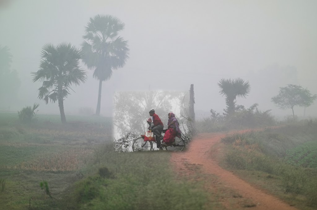 People riding a bicycle on a foggy rural road during West Bengal’s cold wave morning.